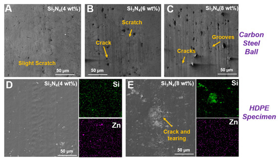Micro-morphologies of the carbon steel ball with different modified HDPE composites: (A) 4 wt% Si3N4 addition; (B) 6 wt% Si3N4 addition; and (C) 8 wt% Si3N4 addition. The element distributions on the polymer plates with different Si3N4 concentrations: (D) 4 wt% addition and (E) 8 wt% addition.