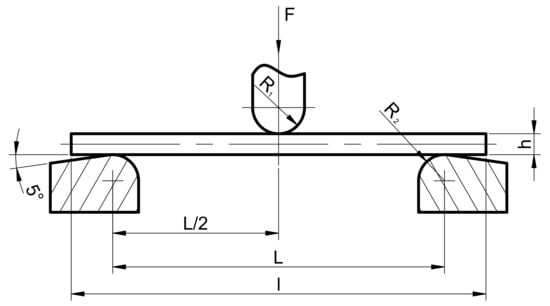 According to the HRN EN ISO 178:2019, R1 = 5 mm ± 0.1 mm and R2 = 2 mm ± 0.2 mm were used for a test specimen with a thickness ≤ 3 mm, h = 2 mm, width of b = 25 mm, and length of l = 40 mm [].