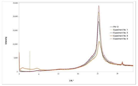 The XRD diffractogram in Figure 2 presents reflection peaks at 2θ = 6.1° and 2θ = 21.4°. These are typical for structures made of pure PA12. It is evident that there was no shift at all, suggesting that no crystal phase transformation or new crystal formation occurred when Cloisite 93A were introduced into the PA12 matrix [,]. A reflection peak at a lower value of diffraction angle was observed for the specimen made according to experiment No. 8 as a result of the increased spacing between layers of nanofiller (from 2.36 to 4.41 nm), which indicates the intercalation of polymer chains within the layers of nanoclay [,].