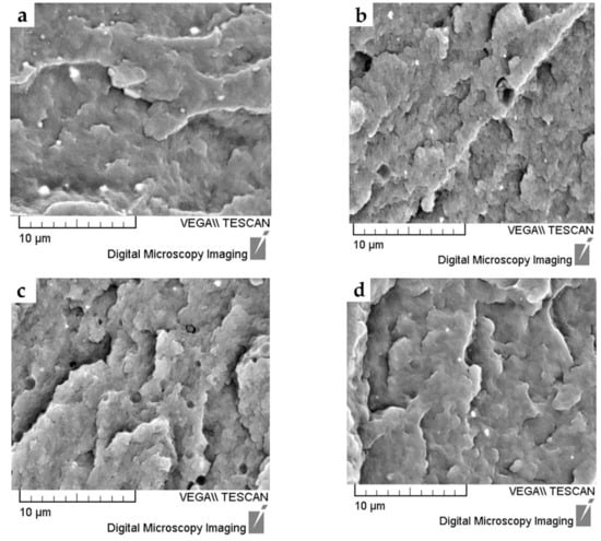The black color of nanoparticles in Figure 3c indicates the non-exfoliated layers of nanoclay in the PA12 matrix for Experiment No. 8. Larger black particles indicate nanofiller agglomeration, which is also in accordance with the XRD diffractogram of specimen 8. Figure 4 shows SEM micrographs of the specimen made out of pure PA12.