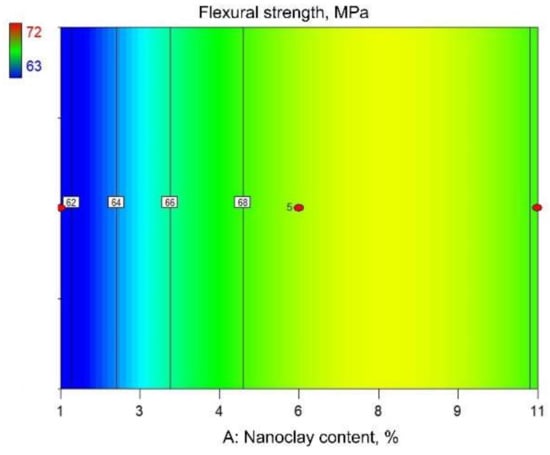 Figure 6 and Figure 7 show graphical representations of the reduced quadratic regression model. The response surface presented in Figure 6 shows the estimated flexural strength dependent on the nanoclay content and the screw rotation frequency. According to Figure 6, nanoclay content has a significant influence on the flexural strength, where the maximum flexural strength value is attained at an approximately 8–8.5% nanoclay content. In contrast to the nanoclay content, the screw rotation frequency does not influence the flexural strength. This could also be concluded from the contour plot shown in Figure 7.