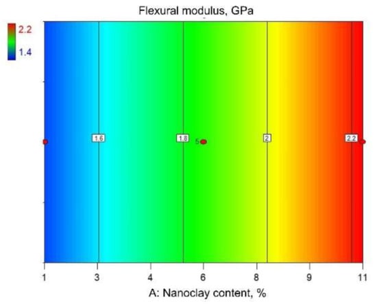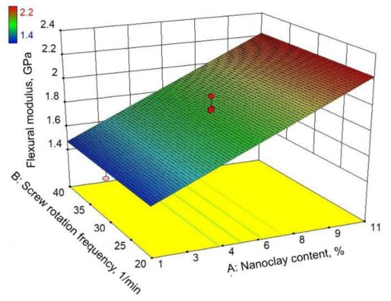 Figure 8 and Figure 9 show graphical representations of the reduced linear regression model. Figure 8 represents the surface plot of Equation (5). It can be seen that the flexural modulus steadily increases with an increasing nanoclay content. As in the case of flexural strength, it can be observed that the screw rotation frequency does not affect the flexural modulus. All this can also be concluded from the contour plot shown in Figure 9.