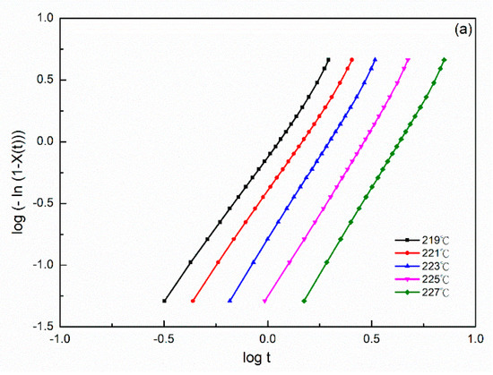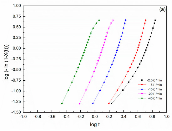 where X(T) is the relative crystallinity, K(T) is the kinetics crystallization rate constant and m is the Ozawa exponent. If the plotting of versus is in accordance with Equation (17), a series of straight lines should be obtained. The experimental findings indicated that Equation (17) was limited to describing the nonisothermal crystallization kinetics of the SP PA66 (Figure 10). When considered in light of Ozawa’s theory, poor fitting of the equation was observed. The sluggish secondary crystallization and the dependency of lamellar thickness on the temperature were not observed; therefore, the model could not describe the complete nonisothermal process of polymers [42,43,44,45].