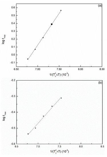 where ΔT is the degree of supercooling ( = ) and B and C are constants. Equation (11) was used to evaluate whether the PA66 samples can be examined using the Avrami equation; if a plot of versus is a straight line, SP PA66 would follow primary crystallization at . The plots for the SP PA66 sample exhibited a good linear relationship (Figure 5).