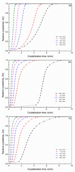 where dHc denotes the measured enthalpy of crystallization during the time interval dt; is the heat generated at time t; is the total heat generated up to the final crystallization process; t0 denotes the initial crystallization time; tc and t∞ denote the time elapsed during the course of crystallization and after the completion of the crystallization process, respectively.