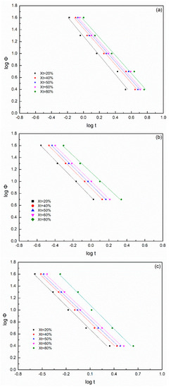 Considering the effect of Φ, Ozawa [41] modified the Avrami equation, Equation (14), into one accounting for all of the processes of nonisothermal crystallization, assuming that the nonisothermal crystallization process is a result of infinitesimally isothermal crystallization procedures, as follows