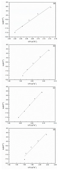 The approximate activation energy and crystallization rate constant of the PA66 samples could be determined by the following Arrhenius equation, as shown in Equations (6) and (7) [29]