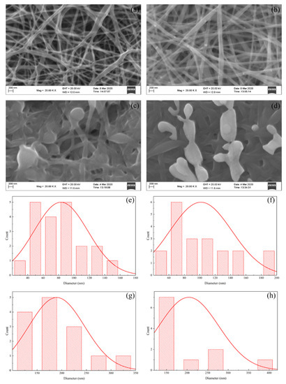 SEM morphological images of (a) PVA nanofiber; (b) PVA/AgNO3 Nanofiber; (c) iodinated PVA nanofiber; (d) iodinated PVA/AgNO3 nanofiber, and the diameter-size distributions of (e) PVA nanofiber; (f) PVA/AgNO3; (g) iodinated PVA nanofiber; and (h) iodinated PVA/AgNO3 nanofiber.