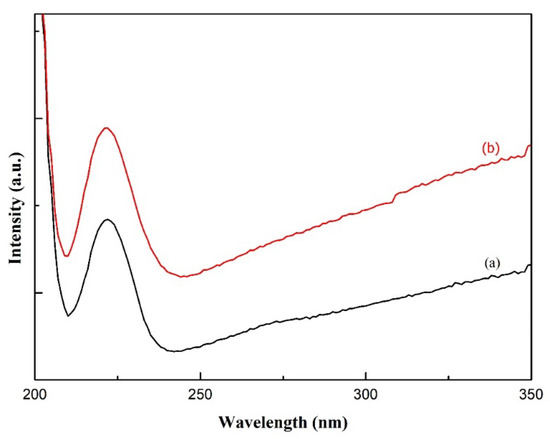A noticeable difference between PVA and PVA/AgNO3 carbon fibers could be observed in Figure 1d,e. Sharp and narrow peaks observed at 1627 cm−1 in the carbon fibers, indicating the presence of aromatic cyclic –C=C–, so sp2 hexagonal carbon structure was confirmed [18]. In addition, the determination of π-π* adsorption band in C=C aromatic cyclic was conducted via UV-Vis Spectrophotometry (Figure 3). As can be seen, the transition occurred at about 225 nm, which is in agreement with [36], who reported a range between 230 and 270 nm and Woodward-Fieser rules who suggested a value equal to 245 nm [37]. Peaks to indicate Ag0 in the interval of 400–420 nm were not observed, as the amount of AgNO3 samples was small. Thus, the confirmation of Ag0 existence was carried out by using TEM.