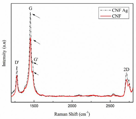 Raman shifts of carbon nanofibers (CNF) with and without the addition of silver nanoparticle (SNP).