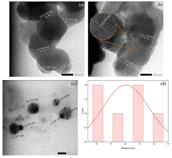 Iodinated PVA and PVA/AgNO3 nanofibers were prepared by pyrolysis. The silver nanoparticles were in spherical shapes with sizes around 10–35 nm (Figure 5). The calcination that occurred at 500 °C (at most) for 6 h has successfully altered the fibrous structure into layers of graphene fibers with an average diameter of 88.62 nm to 120 nm. Figure 5a,b display TEM images of PVA and PVA/AgNO3 carbon fibers, respectively, and the insert in Figure 5b depicts the layers of graphene that were successfully synthesized from the samples.