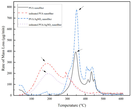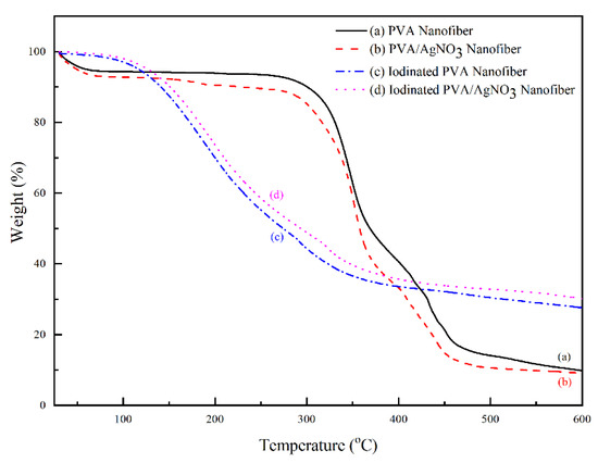The change of mass with increasing temperature can be seen in Figure 6. The iodinated samples had similar mass loss behavior. The decomposition began above 100 °C and completed at 350 °C with 40% residual mass. The decomposition of PVA continued up to 600 °C with only 33% remaining as the final residue. In the below results (Figure 7), the PVA/AgNO3 nanofiber showed the maximum rate of mass loss at 350 °C, which is almost doubled compared to the cases where AgNO3 is absent, and this shows the effect of SNP within the electrospun of PVA/AgNO3. Without the presence of SNP, extensive degradation of PVA occurred above 400 °C [40]; however, the presence of SNP shifted the initial degradation temperature below 300 °C. Based on the DTG, the maximum temperature of degradation of the polymeric backbone occurred at 350 °C, which indicated a significant decrease of the degradation temperature. Compared to a study that utilized Ni metals, the degradation occurred above 500 °C [14,41]. Whilst, in iodinated PVA/AgNO3 sample, the presence of Ag0 in PVA increased the barrier energy. Therefore, the degradation of polymeric chains, as well as the formation of olefin, were delayed and resulted in lower mass loss [39]. In contrast, the non-iodinated samples had only 10% of residue left from the total mass (Figure 6). This significant loss shows that PVA was thermally unstable and could be decomposed into lower molecular constituents with volatile characteristics [14].