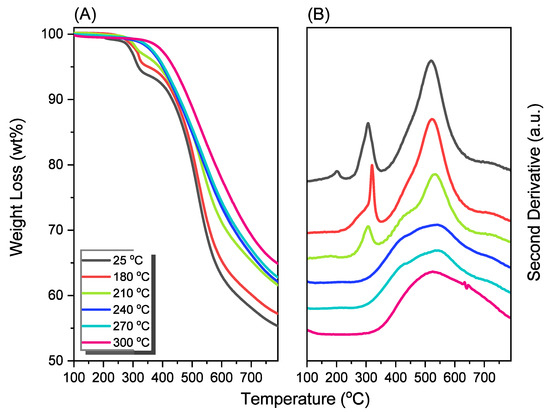 (A) TGA and (B) corresponding second-derivative curves based on TGA analyses of the Por-BZ monomer after thermal ROP at various temperatures.