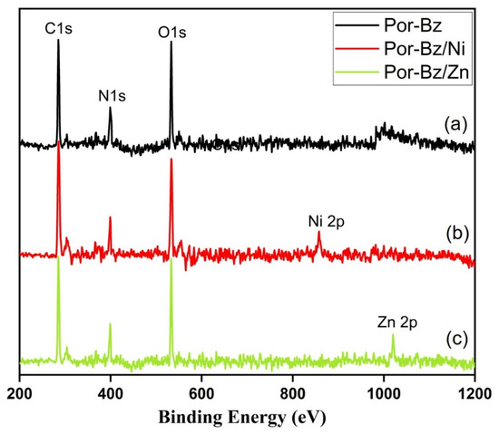 XPS spectra of the (a) Por-BZ monomer, (b) Por-BZ/Ni complex, and (c) Por-BZ/Zn complex.