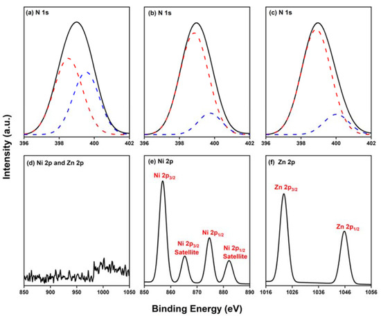XPS spectra of the N1s species (a) Por-BZ monomer, (b) Por-BZ/Ni complex, and (c) Por-BZ/Zn complex. XPS spectra of (d) the Ni 2p, and Zn 2p species of Por-BZ monomer, (e) the Ni 2p species of Por-BZ/Ni complex, and (f) the Zn 2p species of Por-BZ/Zn complex.
