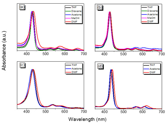 To study the luminescence properties of TAPP, Por-BZ, and the Por-BZ/Ni and Por-BZ/Zn complexes in various solvents, we recorded their UV–Vis absorption spectra at room temperature (Figure 8, Table 1). The highly conjugated porphyrin structure usually exhibits the following features in its UV–Vis absorption spectrum: a very strong absorption band near 400 nm, named the Soret band, resulting from the transition of electrons from the S0 to S2 state; and several weaker signals between 450 and 700 nm, corresponding to the Q band and representing electronic transitions from S0 to S1 [54]. The main peaks of soret bands and Q bands of our products were shown in Table 1. Placing exterior substituents on the porphyrin ring usually induces minor changes in the wavelengths and intensities of the absorption bands, while protonation of the two inner nitrogen atoms or the insertion (or change) of a metal atom at the core of the porphyrin generally has a dramatic effect on the visible absorption spectrum [54]. Compared with the absorption bands of TAPP (Figure 8a), the absorption bands of Por-BZ (Figure 8b) were slightly blue-shifted within 8 nm, whereas the addition of the metal ions caused the bands to red-shift dramatically. After metalation, the peaks of Soret bands red-shifted about 15 nm from Por-BZ to Por-BZ/Ni, and about 40 nm for Por-BZ/Zn; meanwhile Q bands red-shifted about 6 nm after adding Ni2+ ions and 12 nm for Zi2+, relatively. We suspect that the electron-donating units on the phenyl groups at the meso positions of the porphyrin ring enhanced the electron density of the phenyl ring, causing the phenyl ring to conjugate with the porphyrin macrocycle to a certain degree. This kind of conjugation would likely lower the electron transition energy of the porphyrin macrocycle, resulting in red-shifts of the absorption bands. After transforming the NH2 units to BZ rings, this interaction was inhibited, causing the adsorption bands to be blue-shifted. After bonding to the central nitrogen atoms of a porphyrin, metal ions accept the lone pairs of electrons of the N atoms of the pyrrole rings, with the metal ions donating electrons to the porphyrin ring to induce delocalized π-bonds, which permit the ready flow of electrons within the delocalized π-system. In this study, after adding metal ions (Figure 8c,d), the number of Q bands decreased and their absorption frequencies shifted. When the metal ions coordinated with porphyrin ligand, the symmetry of the molecule changed from D2h to D4h, with the cleavage degree of the molecular orbital decreasing and the degeneracy increasing; hence, the number of Q bands decreased [55,56].
