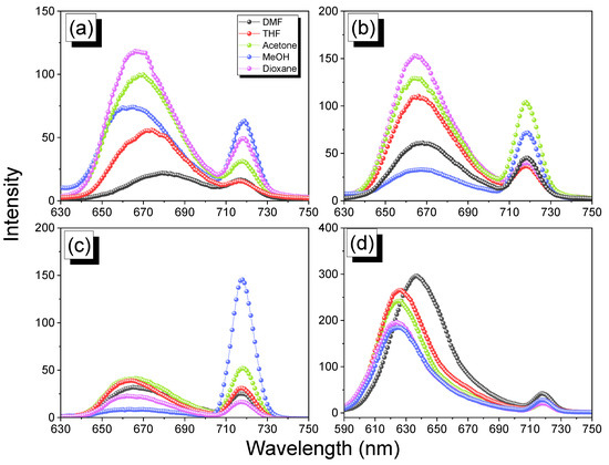 We also recorded PL spectra to measure the fluorescence properties of TAPP, Por-BZ, and the Por-BZ/Ni and Por-BZ/Zn complexes dissolved in several kinds of solvents (Figure 9). Fluorescent materials with highly π-conjugated systems typically exhibit strong luminescence in dilute solution; their fluorescence emissions are typical quenched in solutions of high concentrations or in the solid state, a phenomenon known as “aggregation-caused quenching” (ACQ), a result of strong face-to-face π-stacking [57,58,59,60,61]. Therefore, we investigated the effect of concentration on the fluorescence emissions of TAPP and Por-BZ in DMF upon excitation at a wavelength of 360 nm. Figure S1 reveals that the emission intensity decreased upon increasing the concentrations of both TAPP and Por-BZ in DMF, confirming their ACQ behavior. Furthermore, we investigated the PL behavior of TAPP, Por-BZ, and the Por-BZ/Ni and Por-BZ/Zn complexes by recording their fluorescence emissions when dispersed in various solvents. In general, we prepared solutions of our powder products dissolved in the various solvents at a concentration of 10–4 mol L−1. It was relatively difficult to dissolve Por-BZ and the Por-BZ/Zn complex in MeOH; Porphyrin-BZ-Ni formed suspensions in these organic solvents. The emission spectra are presented in Figure 7, after excitation at a wavelength of 360 nm. According to previous reports [55,62], the typical emission spectrum for a porphyrin shows two peaks centered at approximately 650 and 720 nm, due to the Q (0-0) and the Q (0-1) transitions, respectively. Excitation of our porphyrin derivatives to the S2 (B band) and S1 (Q band) levels resulted in fluorescence, with the fluorescence of the S2 (B band)—representing the transition from the second excited singlet state S2 to the ground state S0 (S2→S0)—corresponding to the Soret band in the UV–Vis absorption spectra. The fluorescence of the Q band is corresponding to the transition from the lowest excited singlet state S1 to the ground state S0. The fluorescence of S2→S0 was too weak to be observed in this study, owing to the light scattering and resorption of the strong Soret absorption bands. Interestingly, compared with the fluorescent bands of TAPP and Por-BZ, the emission peaks of the Por-BZ/Zn complex were much stronger and had been blue-shifted significantly, from 665 nm to 630 nm. Nevertheless, the PL intensity of the Por-BZ/Ni complex was lower than that of Por-BZ, with no shifts of the peaks. Thus, the addition of different kinds of metal ions had dramatically different impacts on the fluorescence properties of Por-BZ.