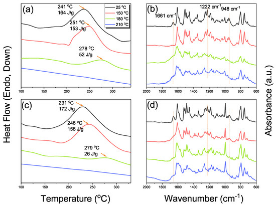 DSC and FTIR spectral analyses of (a,b) Por-BZ/Ni and (c,d) Por-BZ/Zn complexes after thermal ROP at various temperatures.