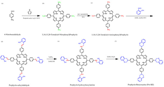 Synthesis of (f) Por-BZ monomer from (a) 4-nitrobenzaldehyde, (b) TNPP, (c) TAPP, (d) Por-Sa, and (e) Por-Hy.