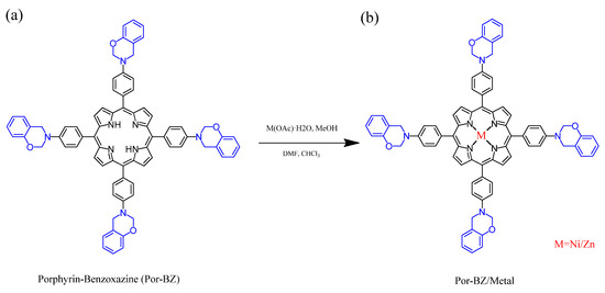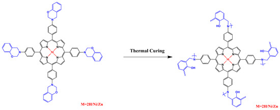 The Por-BZ monomer underwent thermally ring-opening polymerization by heating at 150, 180, 210, 240, 270, and 300 °C (2 h at each temperature) in a stepwise manner. In the same manner, Por-BZ/Ni and Por-BZ/Zn were also subjected to thermal polymerization by heating at 150, 180, 210, and 240 °C; they were at each temperature for 2 h (Scheme 3).