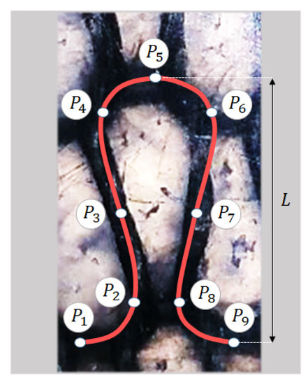 Schematic illustration of the fiber tow centerline curve of a loop of the manufactured knitted carbon fiber/PP composite, and the corresponding points () used to define the B-spline curve.