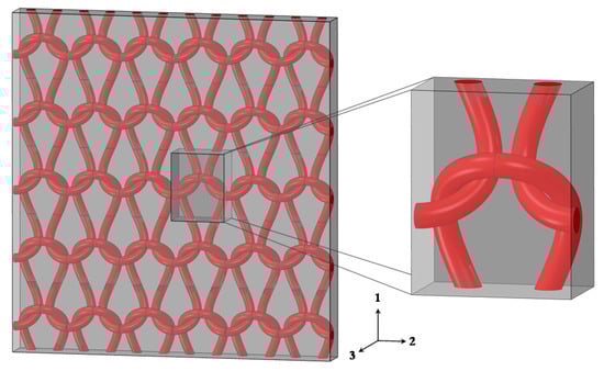 where and indicate the displacement and coordinate of nodes, respectively, “” and “” denote the th pair of opposite nodes on RVE boundaries, is the global strain of the RVE, and . An Abaqus plugin was used to apply the PBCs on the RVE. The generated single-layer knitted fabric composite and the selected RVE are illustrated in Figure 3.