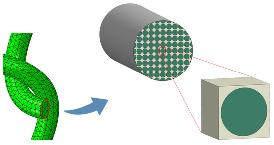 The fiber tow was assumed to be fully impregnated with the matrix, resembling a unidirectional composite with an axis of symmetry along the fiber direction and uniformity in the transverse direction. Therefore, the impregnated fiber tow was modeled as a transversely isotropic elastic material with respect to local coordinates. Due to the anisotropy and curvature, the element local coordinate system of the fiber tow was defined such that the first direction of each element coincides with the fiber direction. The material properties of the impregnated carbon fiber tow were obtained from the microscale analysis outlined in the next section.
