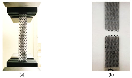 (a) The weft-knitted carbon fiber/polypropylene composite specimen during the tensile test and (b) a tested specimen.
