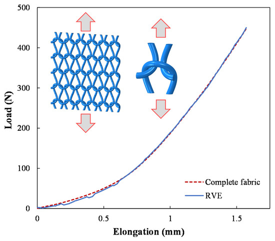 Comparison of the load-elongation curve of the complete fabric model and its RVE under tensile loading in the wale direction.