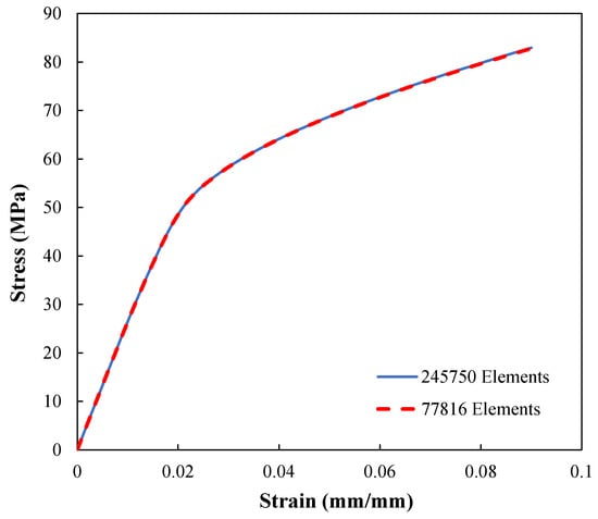 In addition, a mesh refinement study is conducted with two different mesh densities to ensure the mesh-independency of the composite RVE analysis results. Figure 7 indicates that the model is independent of the mesh resolution.