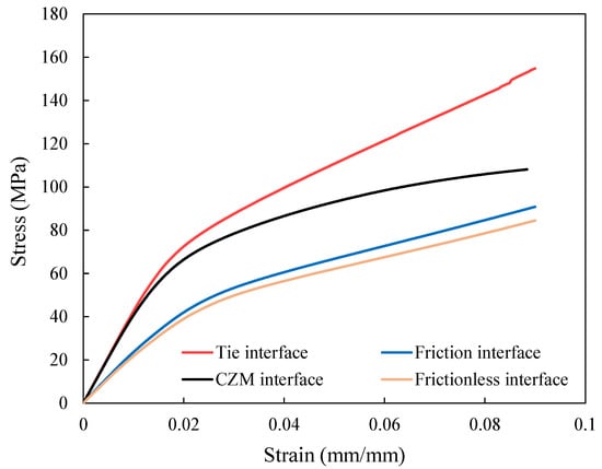 In addition, Figure 8 shows that the frictional interface can slightly enhance the mechanical response compared to the frictionless model. After interfacial failure, friction is the only interaction between debonded surfaces, preventing them from sliding freely. As a result, considering frictional behavior in the interface is a more realistic assumption.