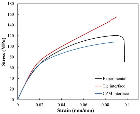 The engineering stress-strain curves obtained from the simulation of the RVE with tie and CZM interfaces are compared with the experimental tensile test result in Figure 10. As can be seen, up to 1% strain, both models can accurately predict the linear elastic response of the composite. However, there are some discrepancies between the simulation results and experimental measurement. The tie interface model starts to overestimate the mechanical response as deformation increases. This error is attributed to the model’s inability to capture the failure at the fiber tow/matrix interfaces.