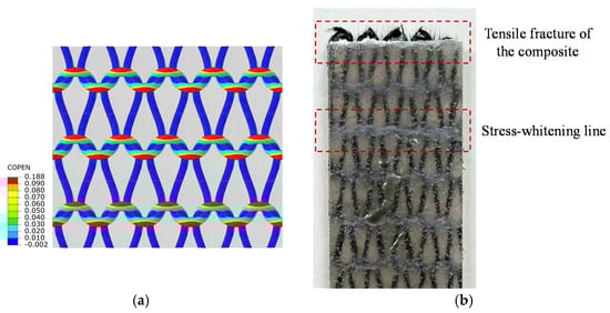 Figure 11a depicts the separation of the fiber tow from the surrounding matrix in the knitted composite loaded in the wale direction based on the simulation results of the RVE. The figure also shows a tested specimen of the knitted composite under the same conditions for comparison. According to the simulation results discussed in the previous section, interface failure is dominant around the knitted loops. This corresponds with the stress whitening marks visible on the tested specimen (Figure 11b). The stress whitening lines, which formed along the knitted loop rows perpendicular to the load direction, indicate the formation and accumulation of microcracks and reorientation of polymer chains. It can also be observed from Figure 11b that the fracture of the specimen occurred at the stress-whitening region.