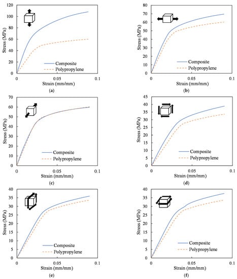 Stress-strain curve of the composite RVE under six periodic loading conditions compared with the pure PP; (a) (wale direction); (b) (course direction); (c) (thickness direction); (d) ; (e) ; (f) .