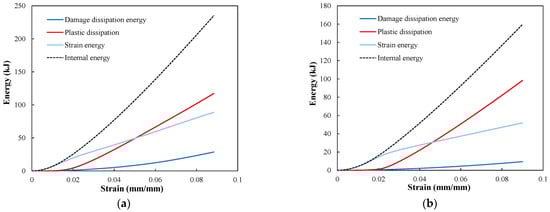 The energy dissipated by the fiber tow/matrix interface failure and matrix plasticity are compared to the elastic strain energy in Figure 13 as a function of strain. The cohesive damage, plasticity, and elastic strain energy are the main energy absorption mechanisms as their summation is almost equal to the total internal energy of the RVE. Figure 13 indicates that the energy dissipated by matrix plasticity during tension is significantly higher than the energy dissipated by the cohesive damage. The energy dissipated by cohesive damage is 12.2% of the total internal energy of the RVE loaded in the wale direction, whereas the contribution of matrix plasticity is almost 49.9%. The rest of the internal energy is a recoverable energy corresponding to the elastic strain energy. The considerable plastic dissipation energy is related to the low fiber volume fraction () and the complexity of the knitted fabric structure, which leads to complex deformation of the matrix. Consequently, the energy absorbed by the matrix, composed of elastic energy and plastic dissipation, is the primary energy absorption mechanism during deformation.