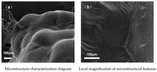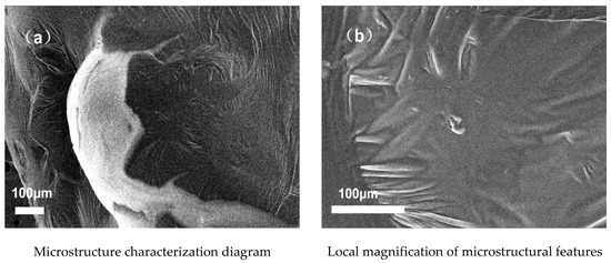 SEM analysis of the structural characteristics of TPU–SBS-modified asphalt with and without the addition of GO provided the experimental results shown in Figure 5 and Figure 6. Figure 5a shows the microstructural characteristics of TPU–SBS-modified asphalt without the addition of GO, and Figure 5b shows the local enlarged form of Figure 5a. Figure 6a shows the microstructure of the TPU–SBS-modified asphalt doped with GO, and Figure 6b shows a partial enlargement of Figure 6a. From the results, it can be seen that the doping of the nanomaterial modifier GO can form a needle-like lamellar structure in the asphalt. Additionally, comparing plots in Figure 5 and Figure 6, it is evident that the doping of GO increased the degree of surface folding of the asphalt matrix, i.e., graphene oxide is present in the composite as folded flakes [26].