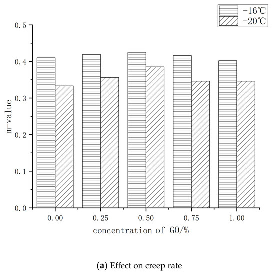 The low-temperature cracking creep performance of the asphalt was tested using a bending beam rheometer, and the results are shown in Figure 7. The low temperature cracking resistance of the modified asphalt is related to the creep stiffness S and creep rate m of the asphalt binder. As can be seen in Figure 7b, the creep stiffness S showed a decreasing trend that then increased with increasing GO doping at −16 °C and −20 °C, with the lowest value occurring at 0.5% GO doping. The influence of GO doping on the creep stiffness S fluctuates widely at both temperatures. As can be seen in Figure 7a, the creep rate m shows an increasing trend that then decreases at −16 °C and −20 °C, with a peak at 0.5% GO doping. However, at −20 °C, the fluctuation range of the effect of GO doping on the creep rate m is significantly larger than at −16°C, indicating that the effect of GO doping on the creep rate m is more significant at lower temperatures. At −16 °C, the creep stiffness of the GO-doped asphalt was significantly lower than at −20 °C. The creep rate was the opposite of the creep stiffness, indicating that the low-temperature crack resistance of the GO-doped asphalt at −16 °C was significantly higher than at −20 °C.