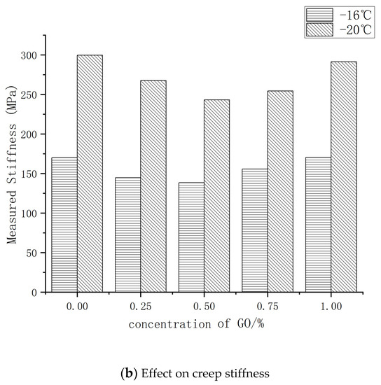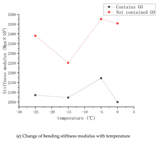 The bending modulus of rigidity can, to some extent, reflect the ease of the low-temperature cracking of the asphalt mixes. The smaller the bending stiffness modulus, the greater the low-temperature cracking energy required for the mix, and the better the resistance to cracking [28]. As can be seen from Figure 8c, the bending stiffness modulus of the mixes containing GO was significantly lower than that of the mixes without GO at the same temperature.