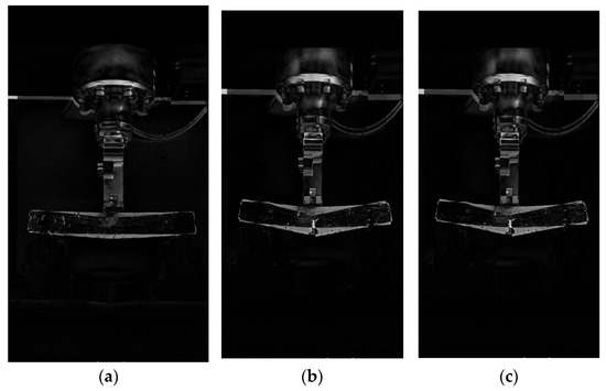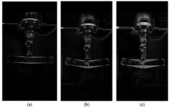 For the low-temperature cracking of a small beam, a typical temperature of −15 °C was chosen. The OpenCV image processing process can be divided into on-site and off-site steps [30]. In the on-site step, the cracking of the beam is recorded by a camera mounted on a stand during a three-point loading test. The duration of the recording is from the start of the loading until the beam cracks and damage occurs. The recorded video is then transferred from the temporary memory of the camera to the permanent memory of the computer hard drive. The frame rate of the original video is maintained during the transfer, and no compression of the video is required.