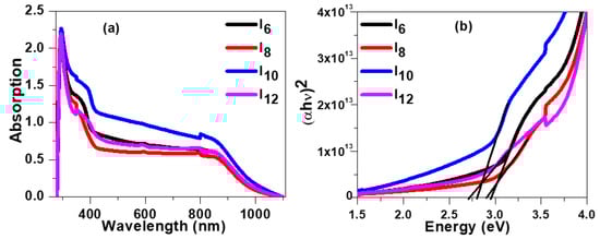 - Tauc, J.; Grigorovici, R.; Vancu, A. Optical properties and electronic structure of amorphous germanium. Phys. Status Solidi B 1966, 15, 627–637. [Google Scholar] [CrossRef]
