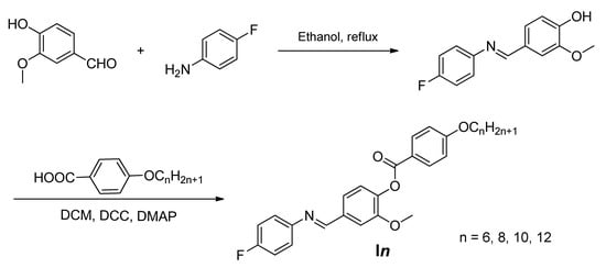 2.1.2. Synthesis 4-(((4-Fluorophenyl)imino)methyl)-2-methoxyphenyl 4-alkoxybenzoate, In