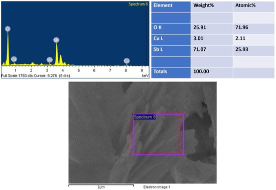 By using EDS, the compositional analysis of nanomaterial was examined, as shown in Figure 2. EDS displayed peaks related to antimony (Sb), copper (Cu) and oxygen (O), showing the existence of the corresponding elements and suggesting their existence in the prepared nanomaterial. EDS revealed 71 wt% of Sb and 3 wt% of Cu, indicating the growth of Cu2O-doped Sb2O3. The lack of any extra peak in EDS suggested that the synthesized Cu2O-Sb2O3 nanomaterial contained no impurity.