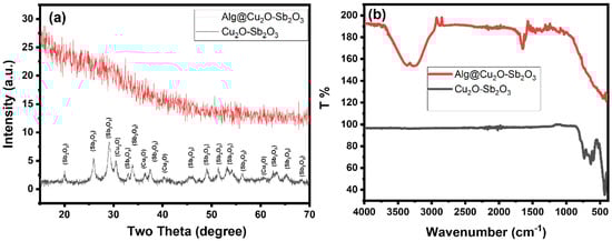 (a) XRD and (b) ATR-FTIR of Cu2O-Sb2O3 and Alg@Cu2O-Sb2O3 nanocatalysts.