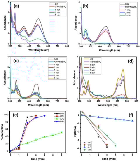 (a–d) UV–Vis spectra, (e) % reduction and (f) kinetics of CR, MO, ArO and MB reduction by NaBH4 using 10 mg Alg@Cu2O-Sb2O3 nanocatalyst.