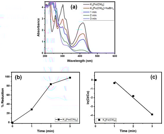 (a) UV–vis spectra, (b) % reduction and (c) kinetics of K3[Fe(CN)6] in the presence of NaBH4 using 10 mg Alg@Cu2O-Sb2O3 nanocatalyst.