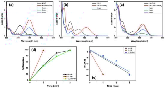 (a–c) UV–Vis spectra, (d) % reduction and (e) kinetics of 4-NP, 2-NP and 2,6-DNP in the presence of NaBH4 using 10 mg Alg@Cu2O-Sb2O3 nanocatalyst.
