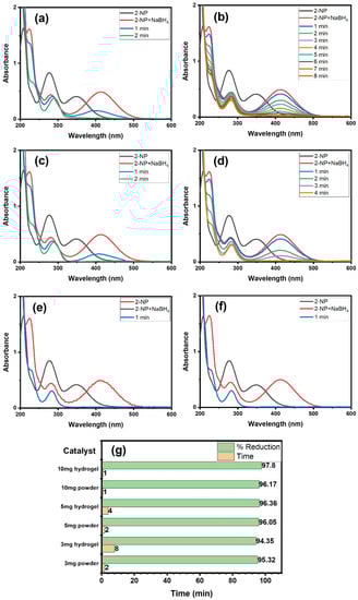 For a comprehensive study, we examined the impact of Alg@Cu2O-Sb2O3 hydrogel and powder Cu2O-Sb2O3 amounts on 2-NP reduction using NaBH4 reducing agent. Hence, 3, 5 and 10 mg each of Cu2O-Sb2O3 and Alg@Cu2O-Sb2O3 nanocatalysts were added for the reduction of 2-NP to ascertain the impact of catalyst quantity (Figure 7). Figure 7g exhibits the graph of catalyst quantity vs. % reduction as well as the time consumed while maintaining constant amounts of NaBH4 and 2-NP. The Alg@Cu2O-Sb2O3 quantity plays a major role in speeding up the reaction and lowering the reaction time. 3 mg, 5 mg and 10 mg of Alg@Cu2O-Sb2O3 reduced 2-NP in 8.0 min, 4.0 min and 1.0 min, respectively. Meanwhile, similar amounts of powder Cu2O-Sb2O3 took 2.0 min and 1.0 min to reduce 2-NP. Thus, the role of Cu2O-Sb2O3 and Alg@Cu2O-Sb2O3 was evidently noticed, and hence, the Cu2O-Sb2O3 and Alg@Cu2O-Sb2O3 quantity plays a substantial role in the rate of 2-NP reduction. Therefore, Cu2O-Sb2O3 is very effective, but powder Cu2O-Sb2O3 has limitations, i.e., it is difficult to separate from the reaction in comparison with the present hydrogel. The powder catalyst has the drawback that it cannot be collected and separated from reaction media in order to recycle it. Hence, a requirement for a good catalyst would be to remove or reduce these concerns. Consequently, Cu2O-Sb2O3 was packed in hydrogel for the purpose of handling and surmounting all the above-mentioned concerns.