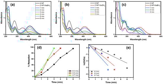UV–Vis spectra in the presence of (a) 0.3 mL, (b) 0.5 mL and (c) 0.7 mL NaBH4, (d) % reduction and (e) kinetics of 2-NP using 5 mg Alg@Cu2O-Sb2O3 nanocatalyst.
