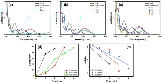UV–Vis spectra of 2-NP reduction: (a) 0.065 mM, (b) 0.074 mM, and (c) 0.093 mM, (d) % reduction and (e) kinetics using 5 mg Alg@Cu2O-Sb2O3 and 0.5 mL NaBH4.