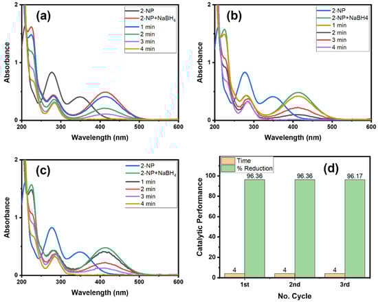 UV–Vis spectra for the reduction of 2-NP: (a) 1st cycle, (b) 2nd cycle, (c) 3rd cycle, and (d) comparative reduction time and % reduction in terms of recyclability using 5 mg Alg@Cu2O-Sb2O3 in 2 mL 2-NP and 0.5 mL NaBH4.